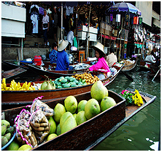 태국의 정취가 물씬 풍기는 수상시장에서 활기찬 상인들과